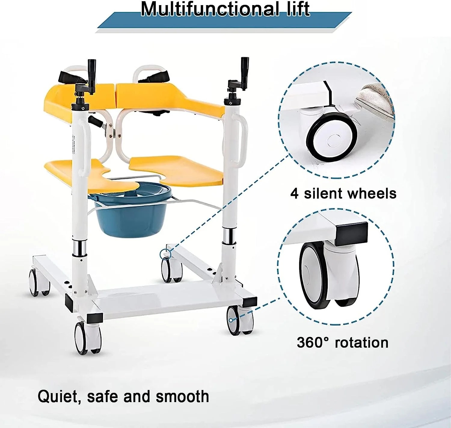 • Multifunción en uno: este equipo tiene varios propósitos y se puede utilizar como mesa de noche, silla de baño, silla de ducha, elevador de pacientes o silla de ruedas. Este elevador de pacientes mueve a los pacientes de camas a sillas, inodoros, muebles y mucho más.